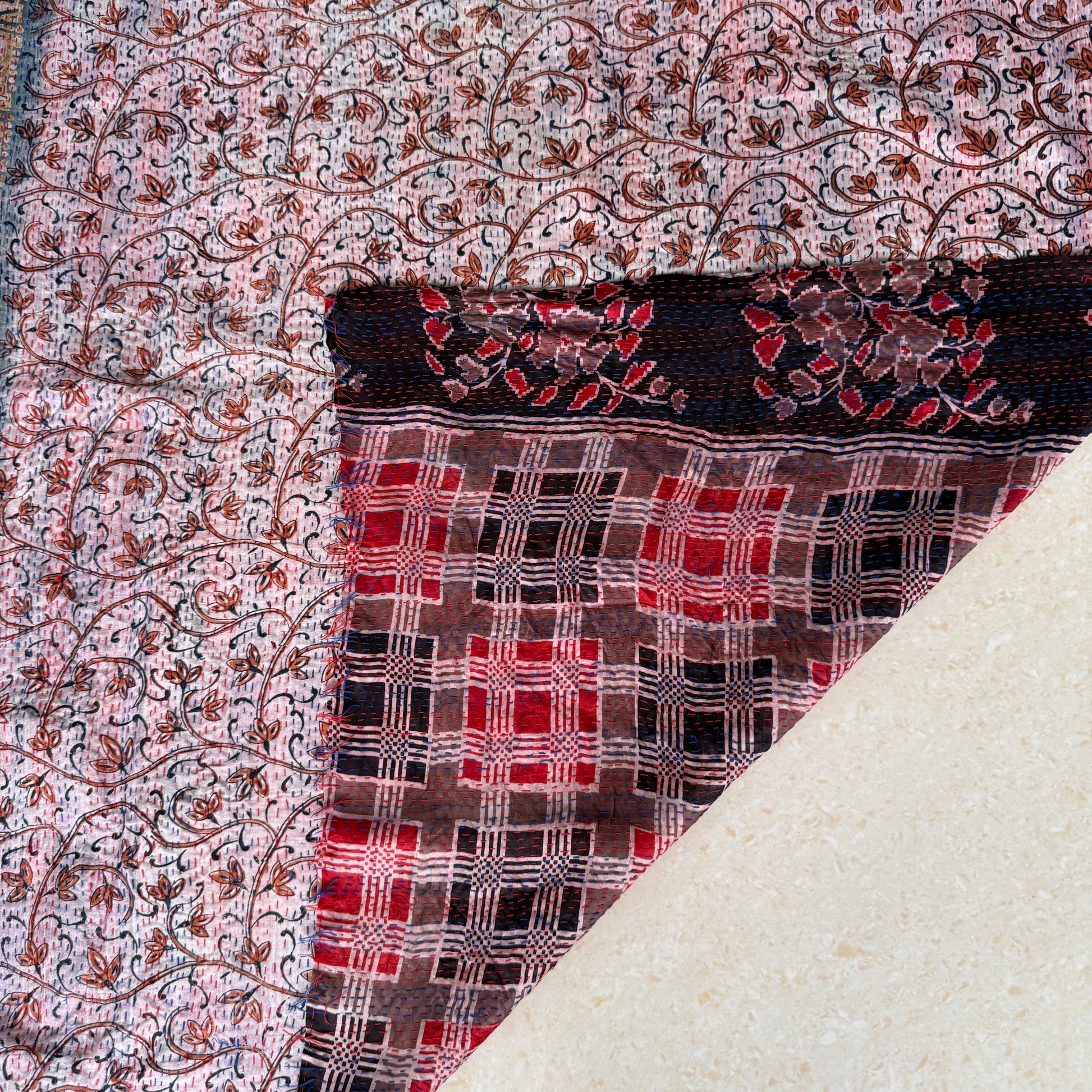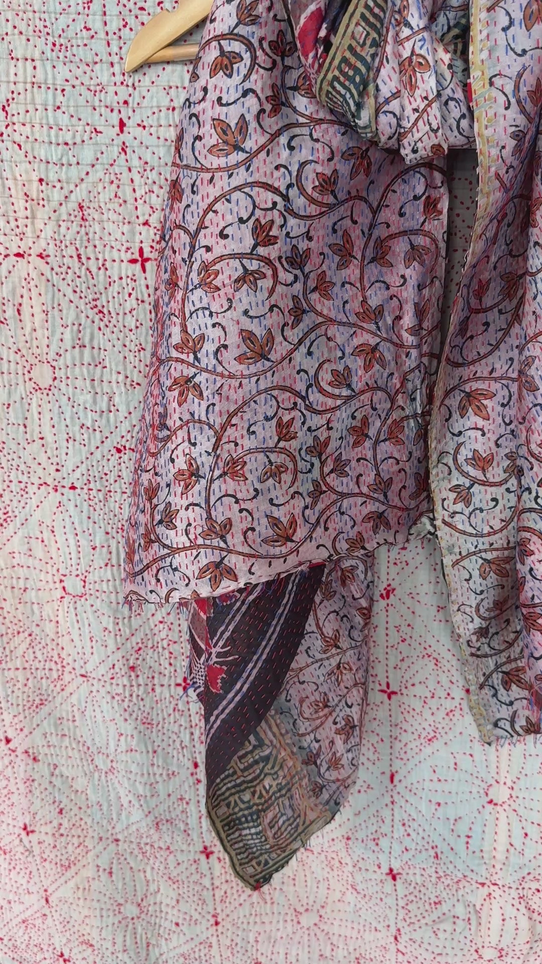 Hand sourced in Jaipur and Delhi, our bespoke kantha scarves are two pieces of vintage saris bonded together with a traditional kantha stitch. We select the best prints and colours to create a truly unique and bespoke accessory that you'll want to wear time and time again. As these pieces are recycled, they may come with slight imperfections but that's all part of their beauty!