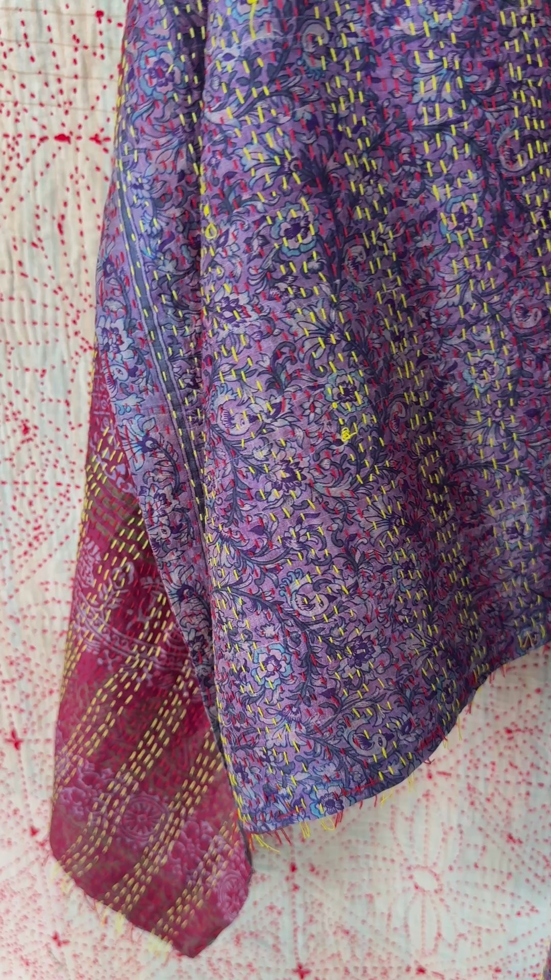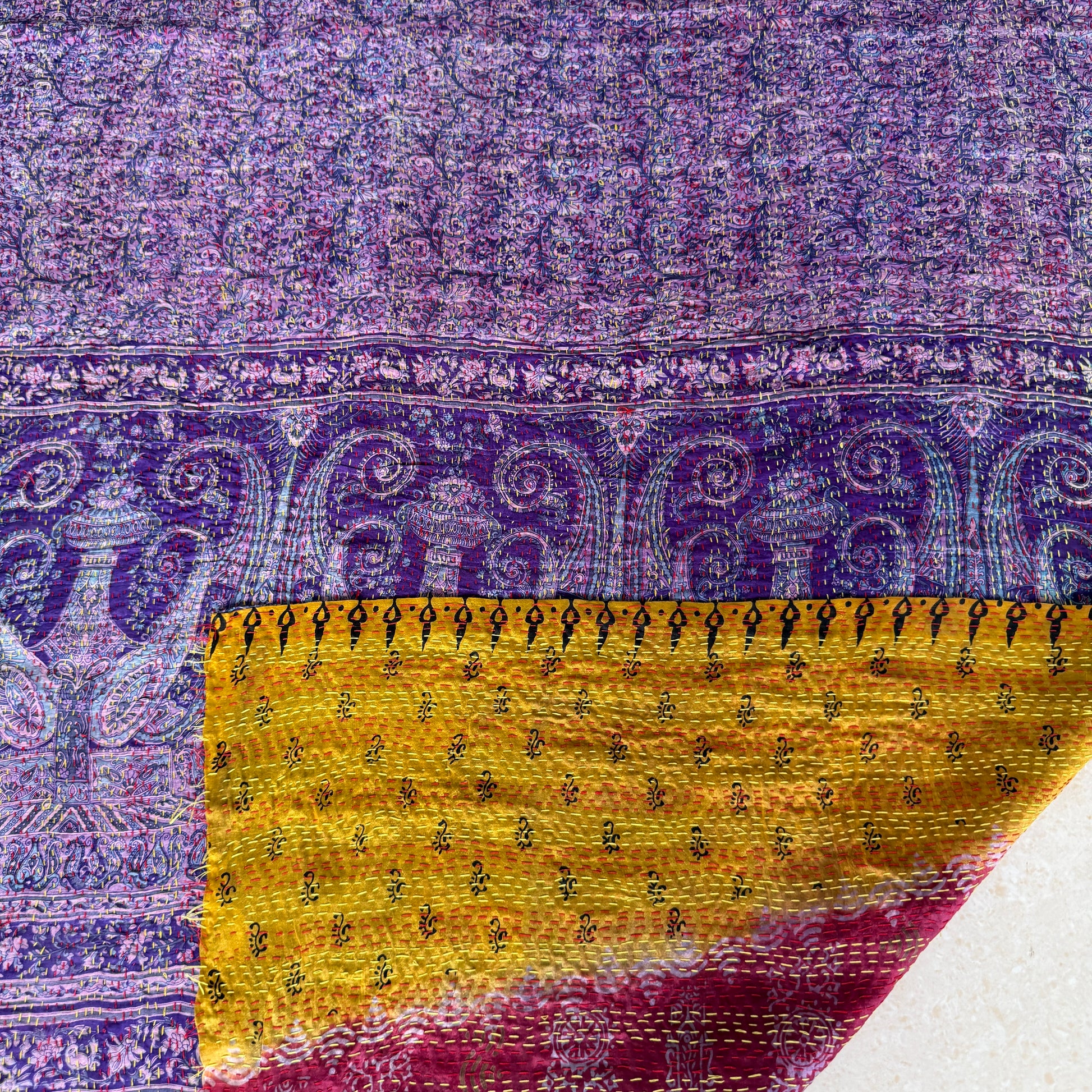Hand sourced in Jaipur and Delhi, our bespoke kantha scarves are two pieces of vintage saris bonded together with a traditional kantha stitch. We select the best prints and colours to create a truly unique and bespoke accessory that you'll want to wear time and time again. As these pieces are recycled, they may come with slight imperfections but that's all part of their beauty!