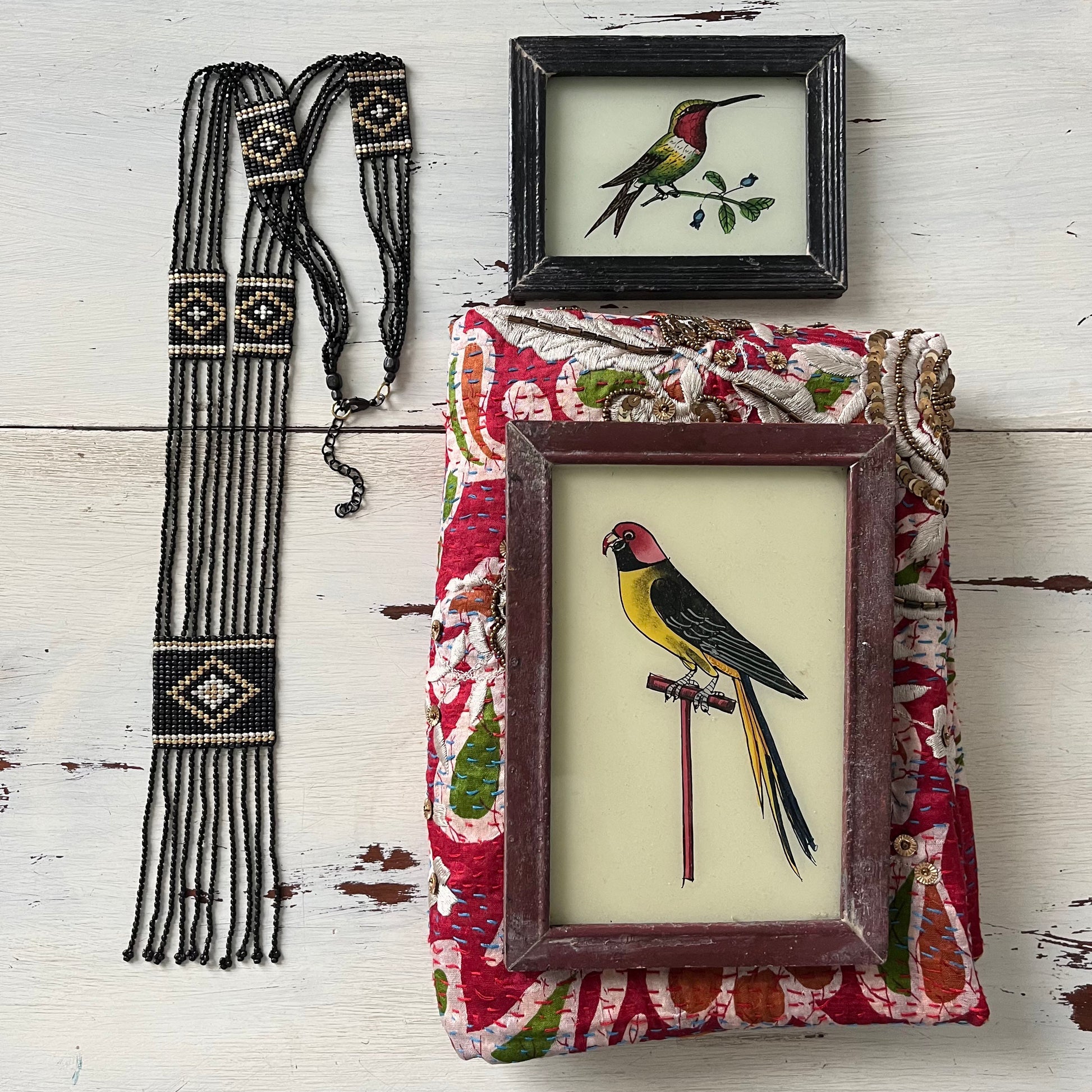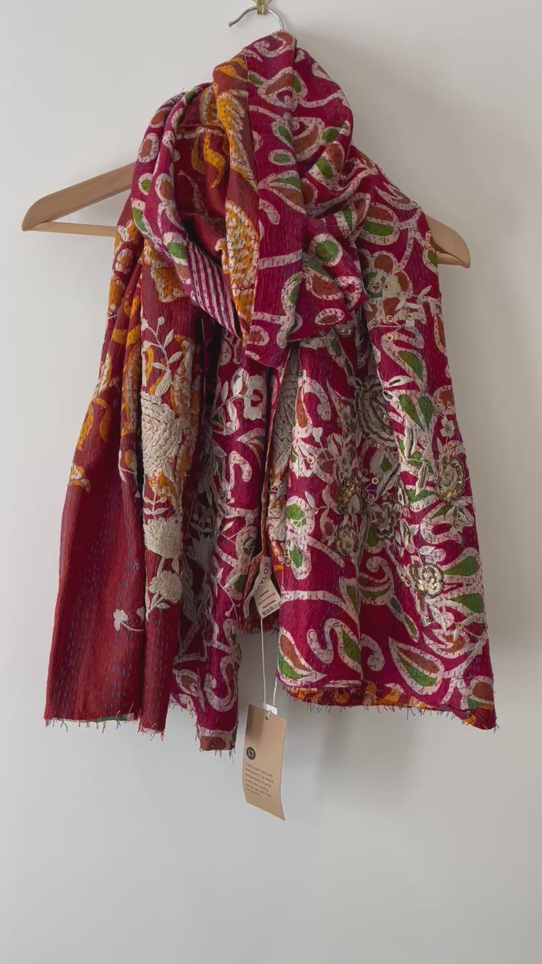 Hand sourced in Jaipur and Delhi, our bespoke kantha scarves are two pieces of vintage saris bonded together with a traditional kantha stitch. These accessories are crafted in the best prints and colours to create a truly unique piece, which is then embroidered with four panels of our signature cherry blossom embroidery. As these pieces are recycled, they may come with slight imperfections but that's all part of their beauty!