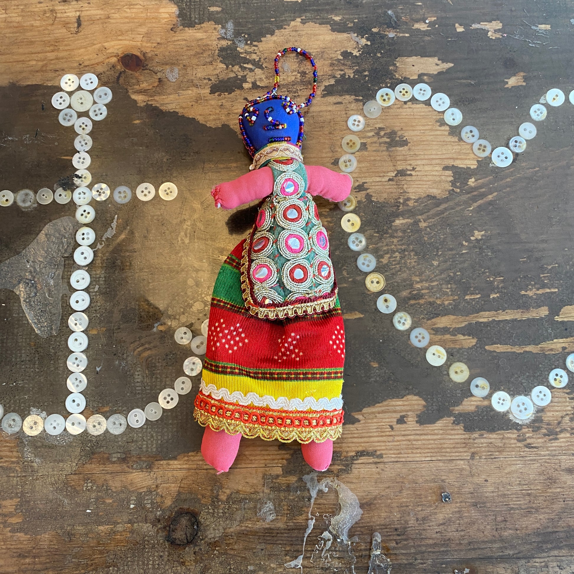 Our one-of-a-kind Gujarati Dolls are handmade within artisanal communities in the desert area of Kutch in India. Handcrafted from local off-cuts of fabric and trims, with bead detail and beaded hanging loop. They make a great, unique gift.