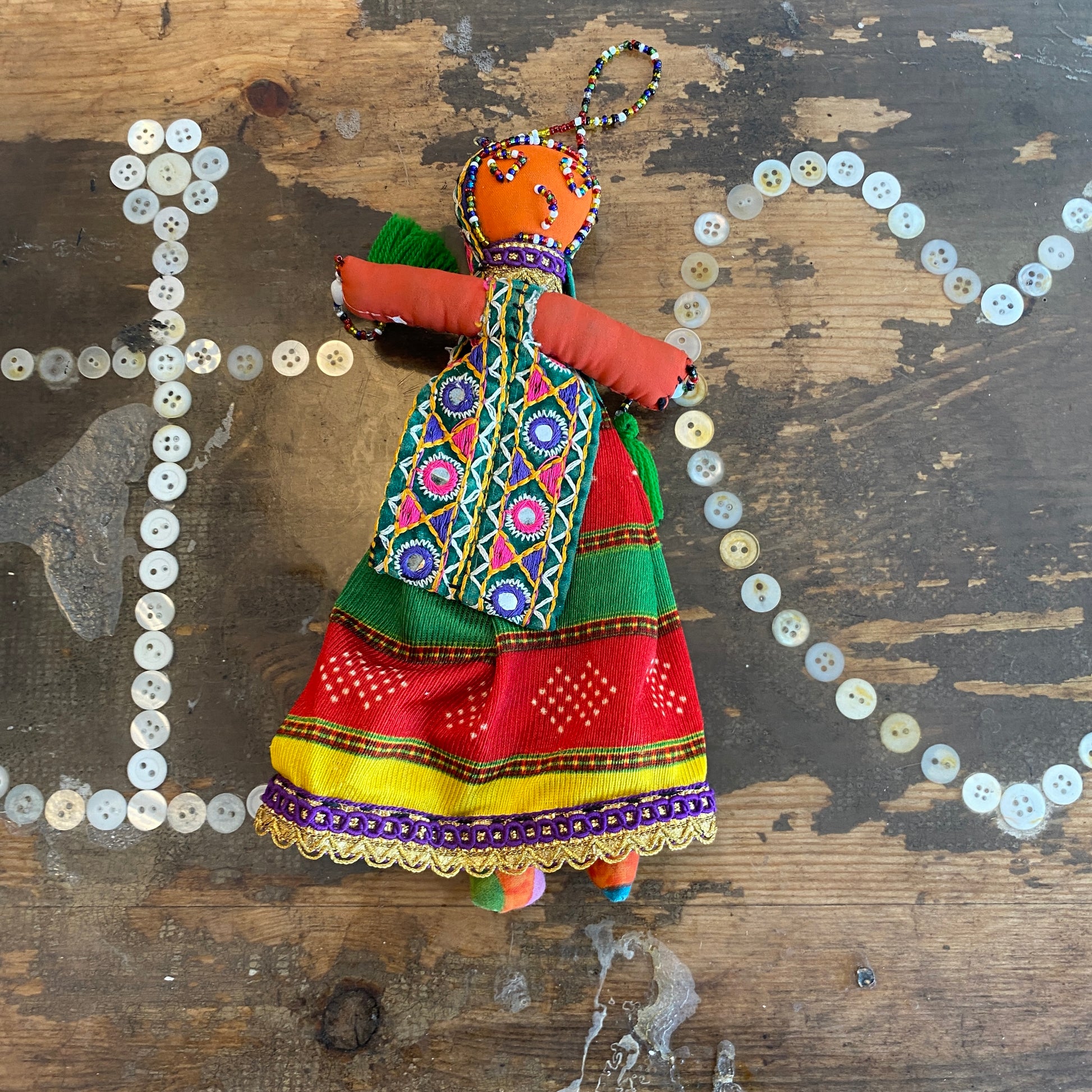 Handcrafted from local off-cuts of fabric and trims, with bead detail and beaded hanging loop.