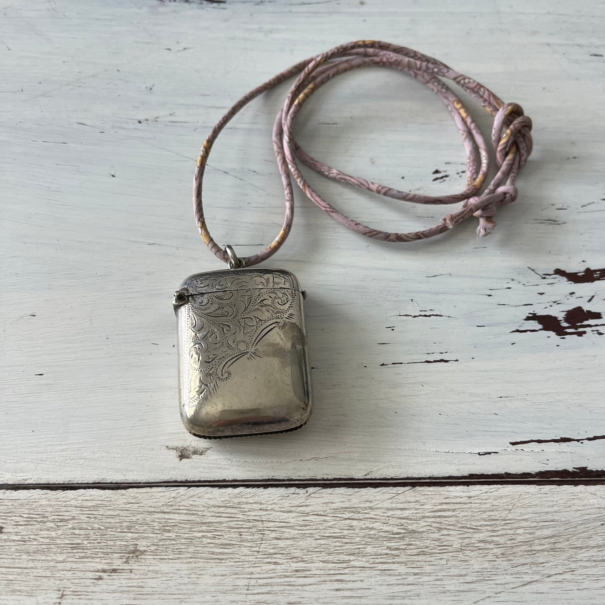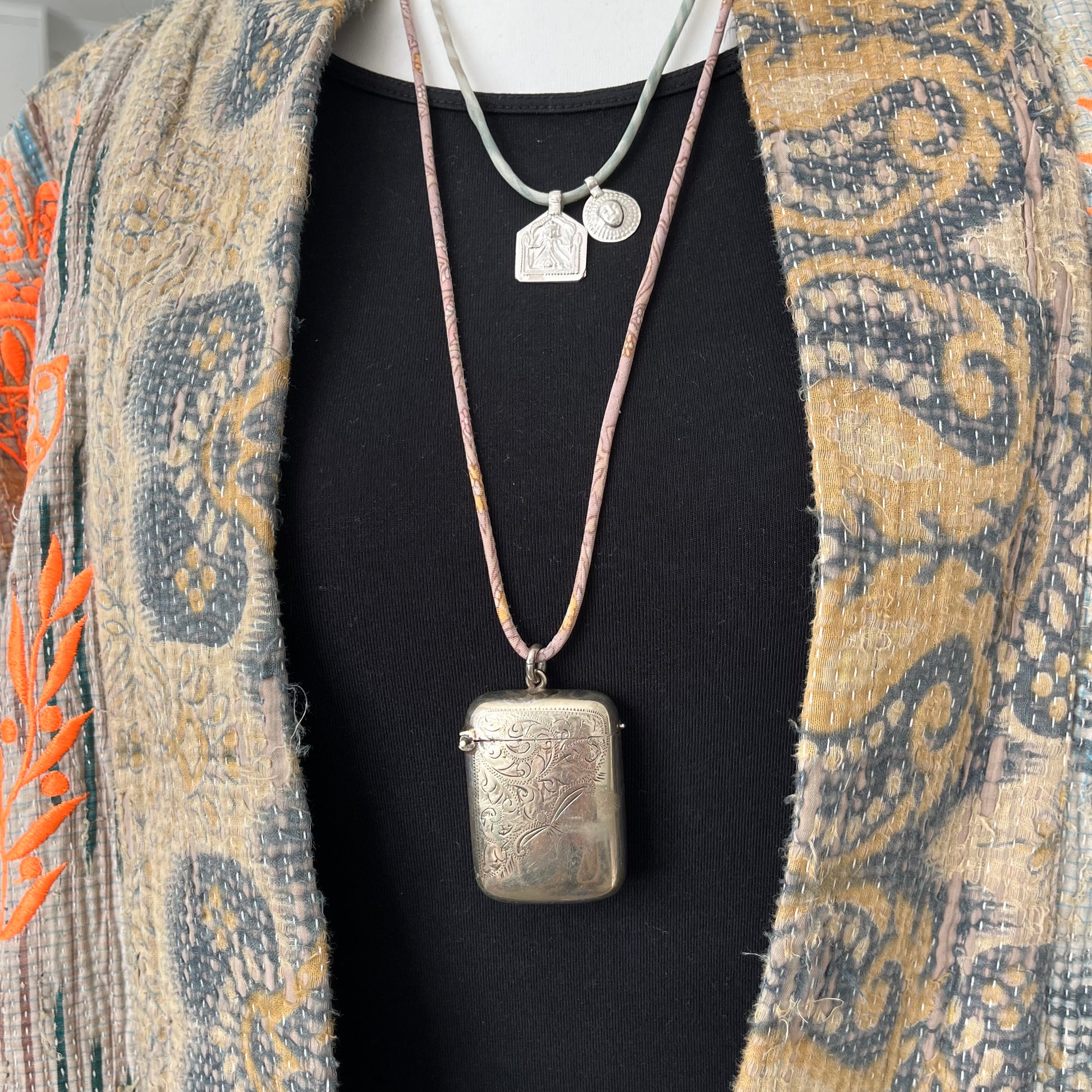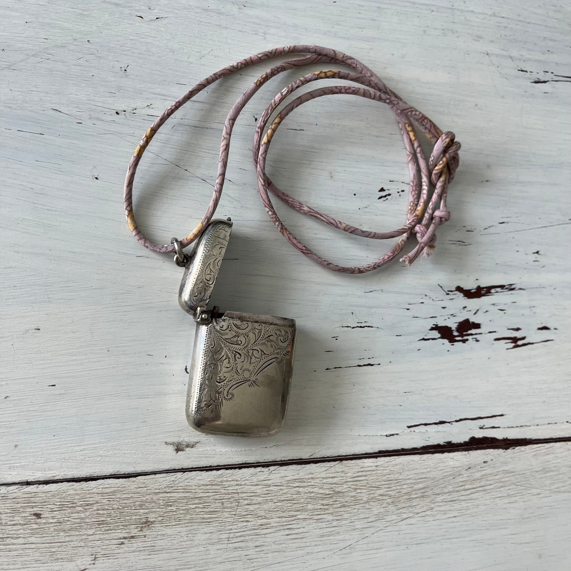 These cute little pendants are vesta cases from the Victorian era. They were used to hold matches back then, so each has a flip-top lid.
