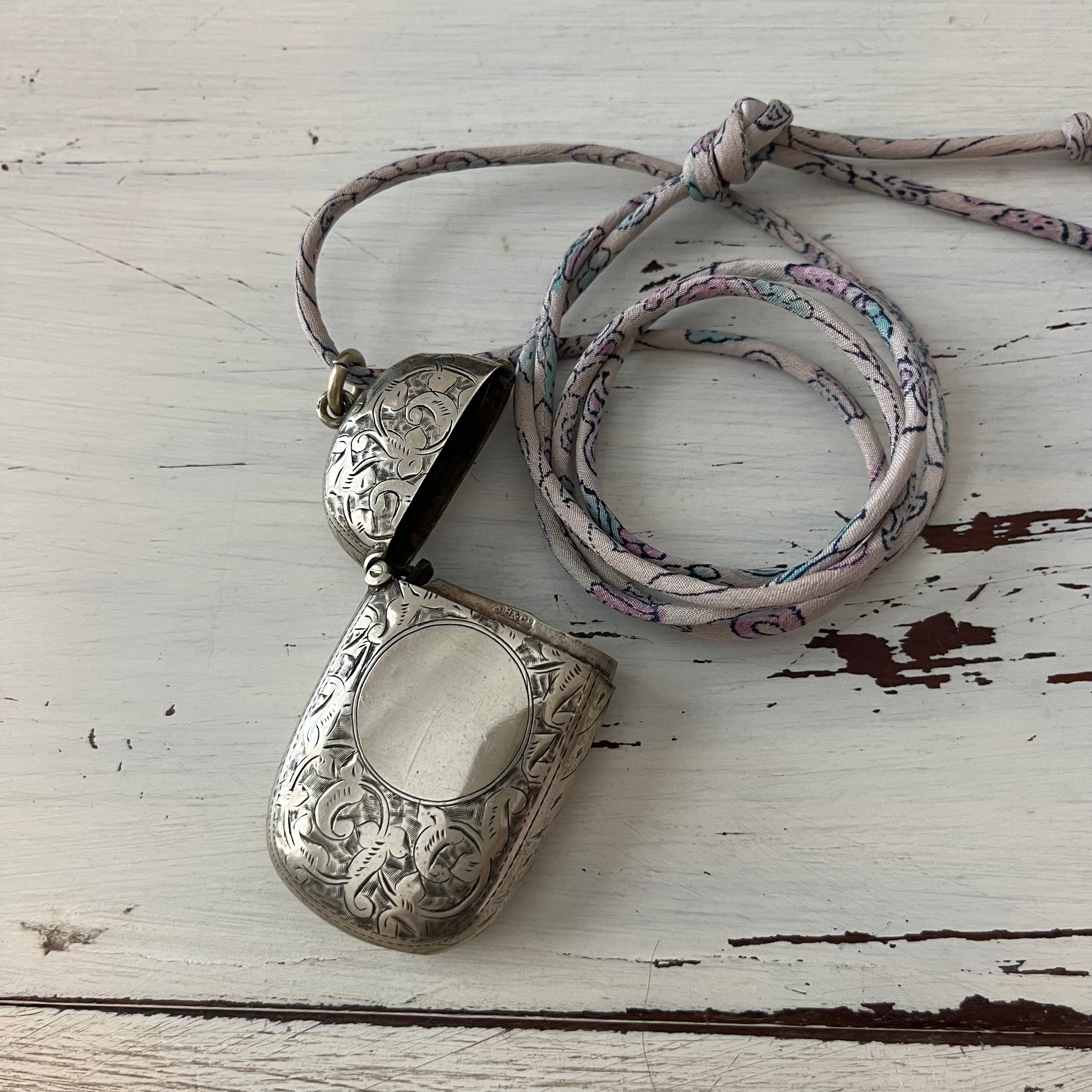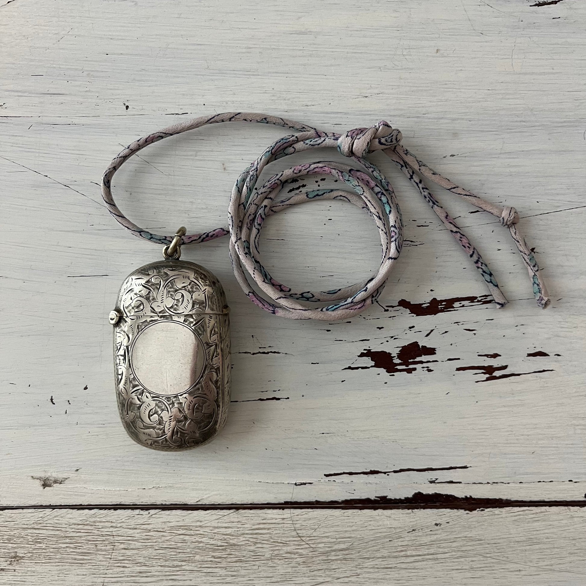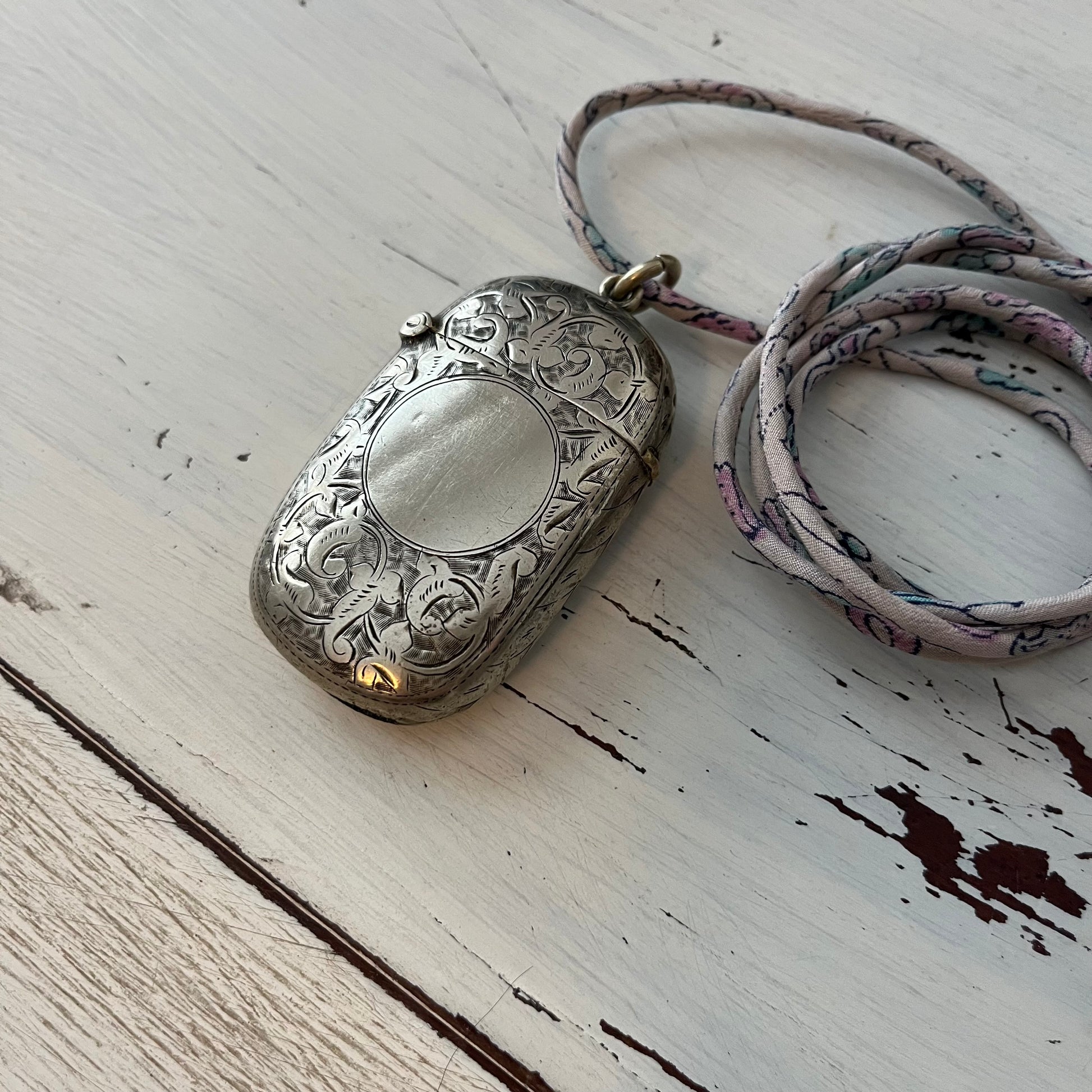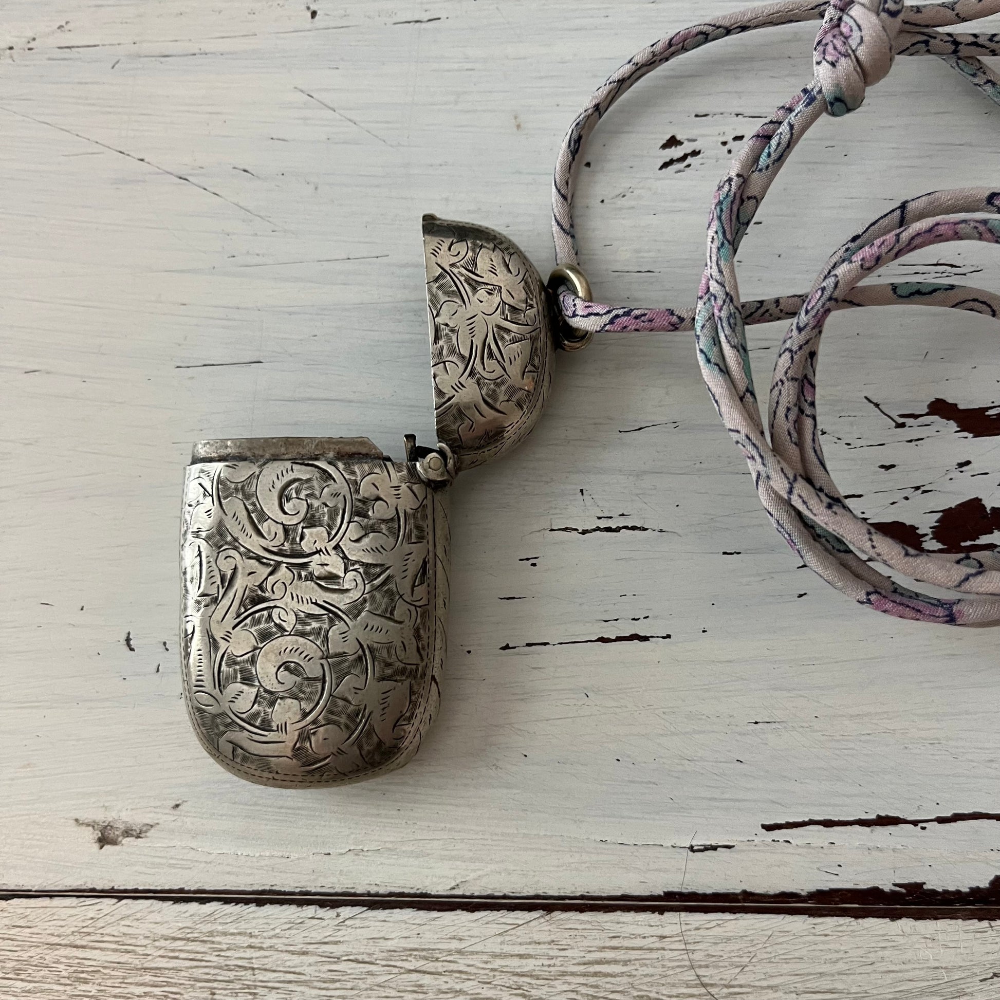 These cute little pendants are vesta cases from the Victorian era. They were used to hold matches back then, so each has a flip-top lid.