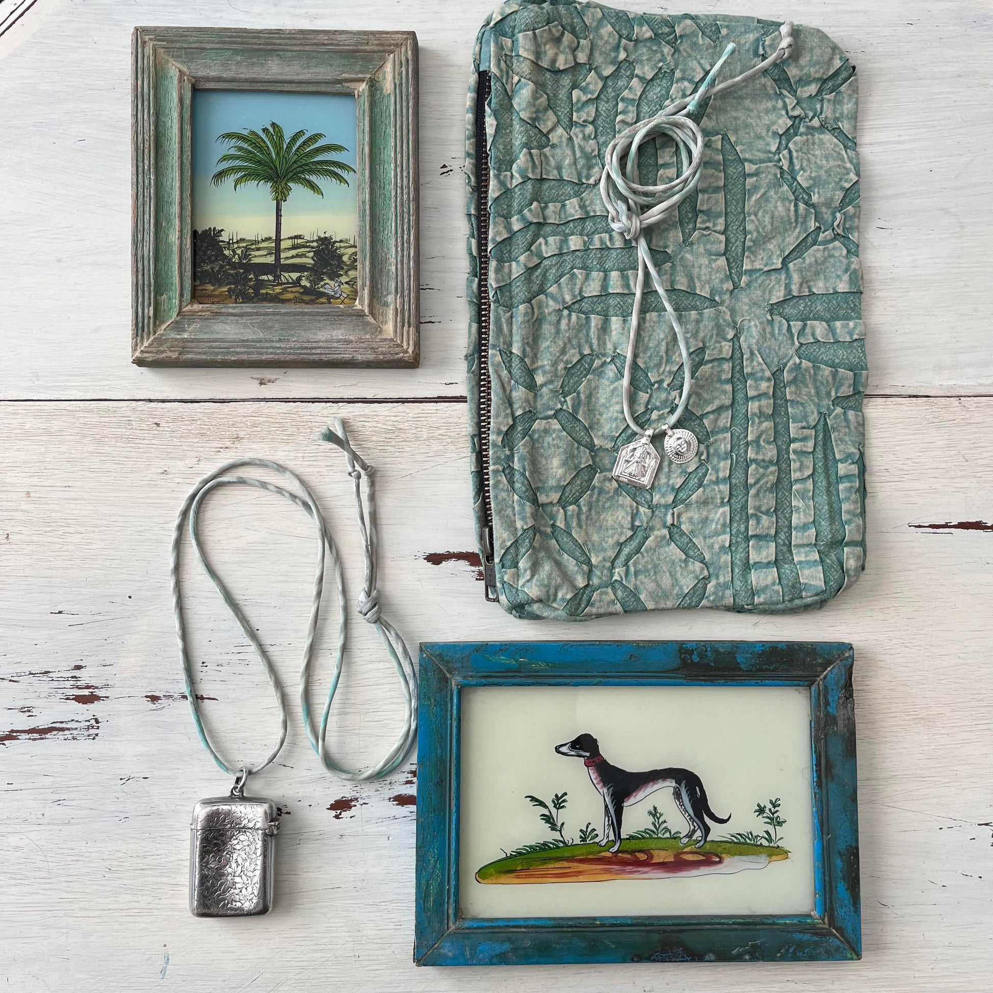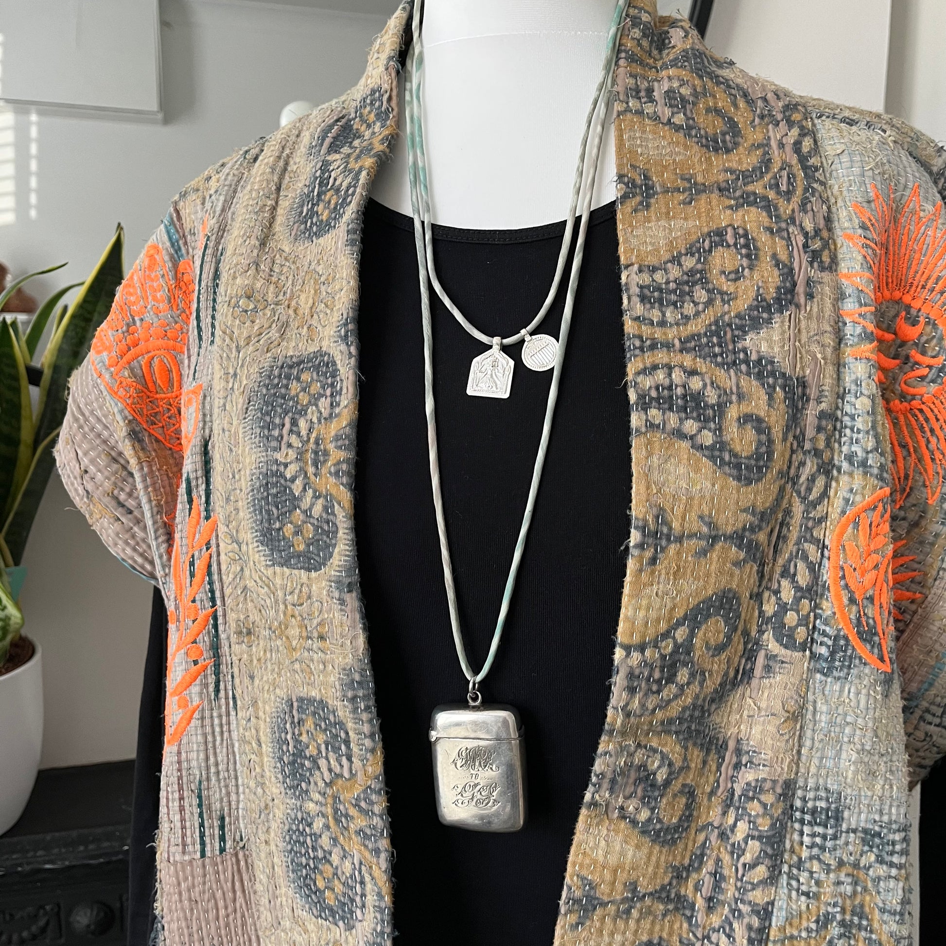 These beautiful antique pendants have been hand-sourced in the UK and hung on recycled silk sari cords to add a pop of colour and modern twist.