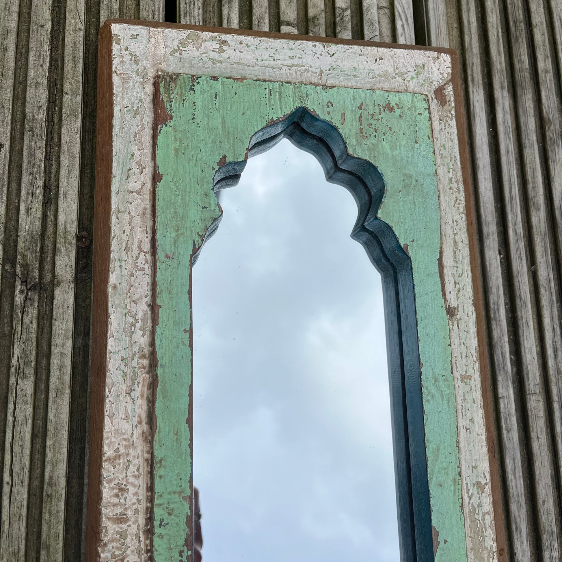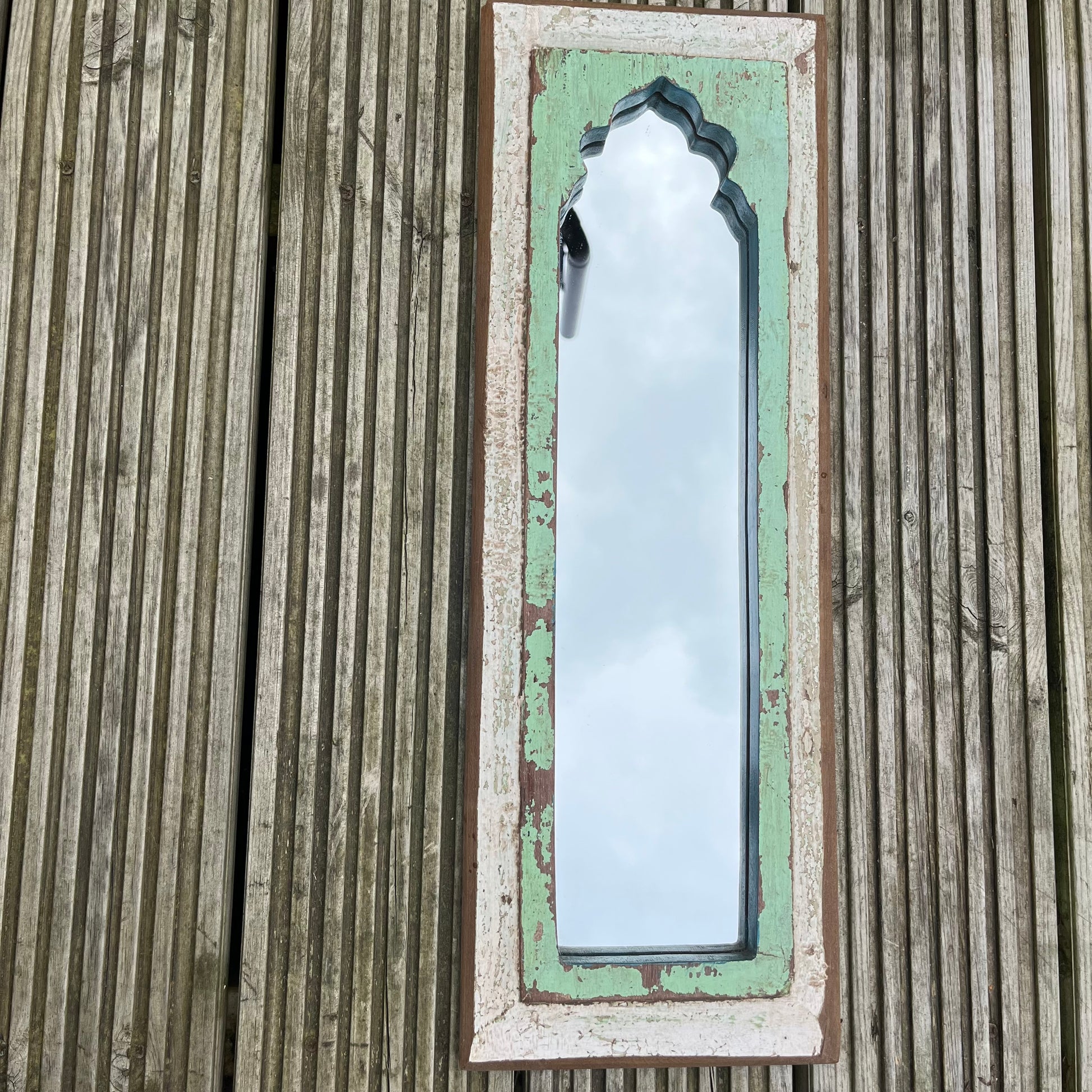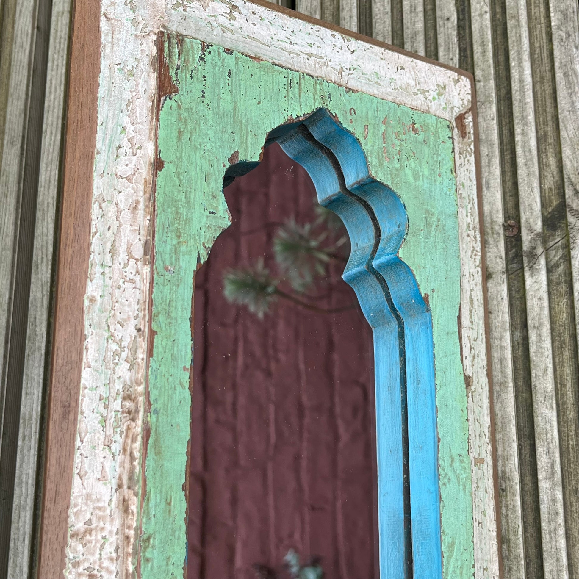These beautiful Indian mirrors are handmade from reclaimed teak wood cupboard doors. Each mirror has their own unique vintage frame with the inside frame painted in a beautiful sky blue.