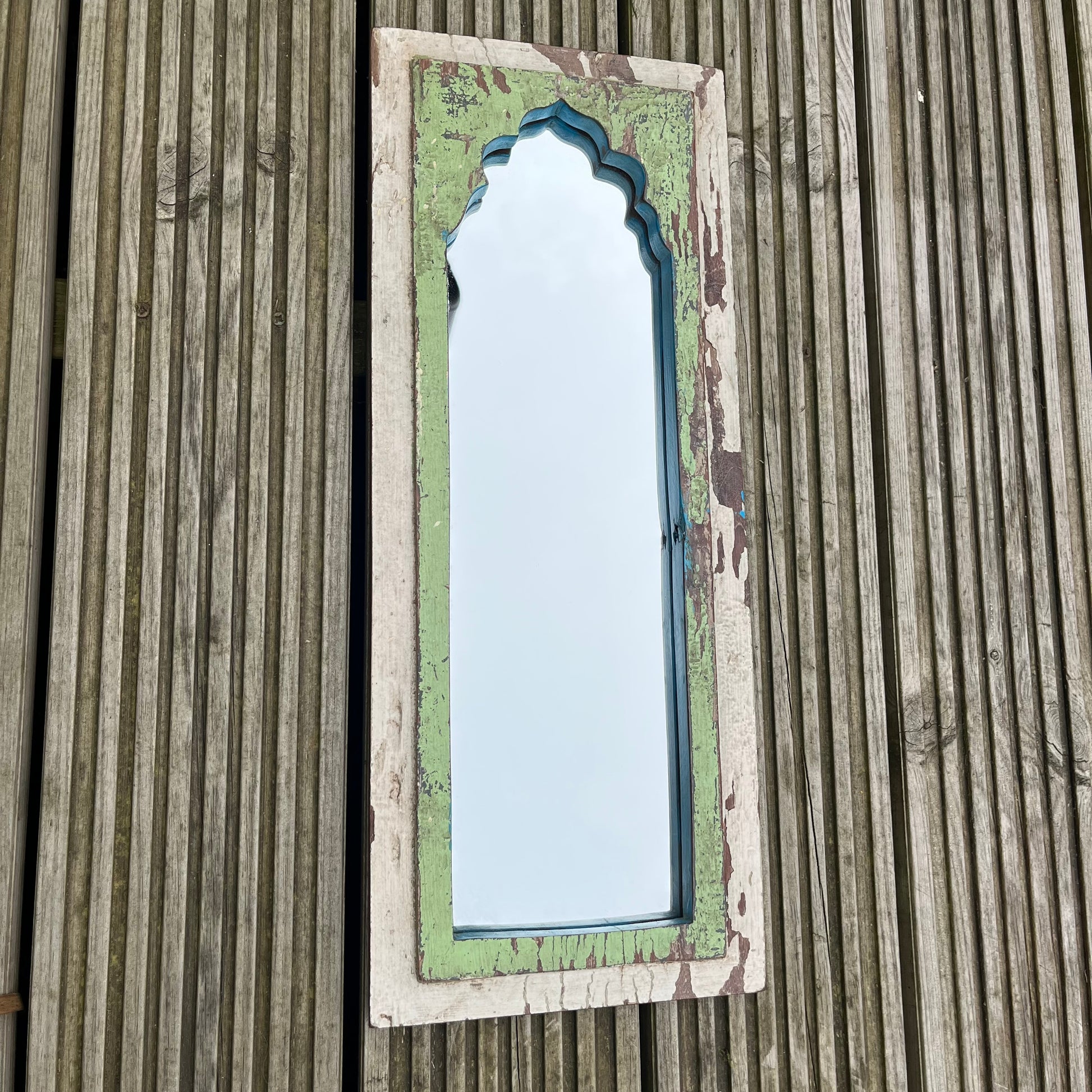 These beautiful Indian mirrors are handmade from reclaimed teak wood cupboard doors. Each mirror has their own unique vintage frame with the inside frame painted in a beautiful sky blue.